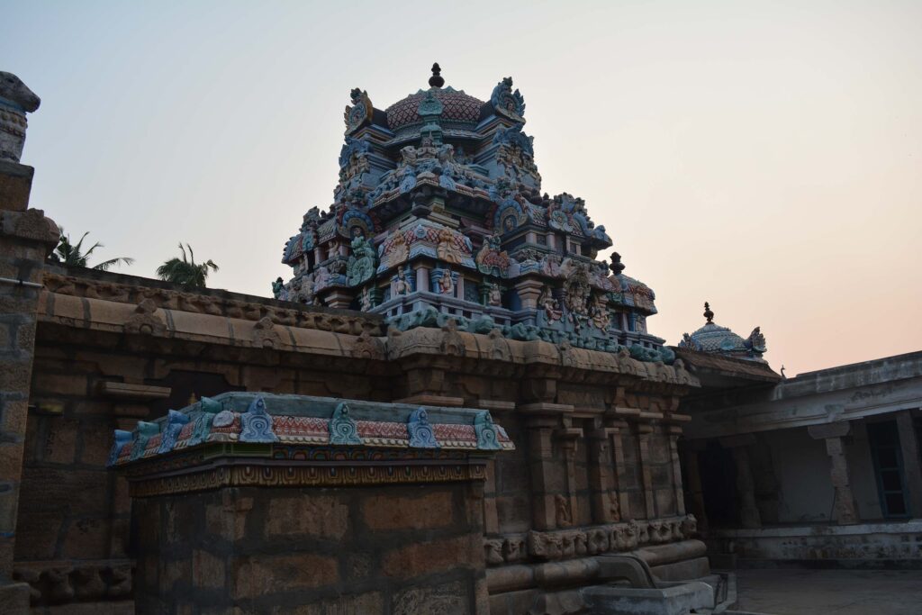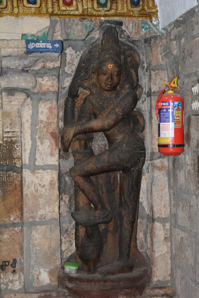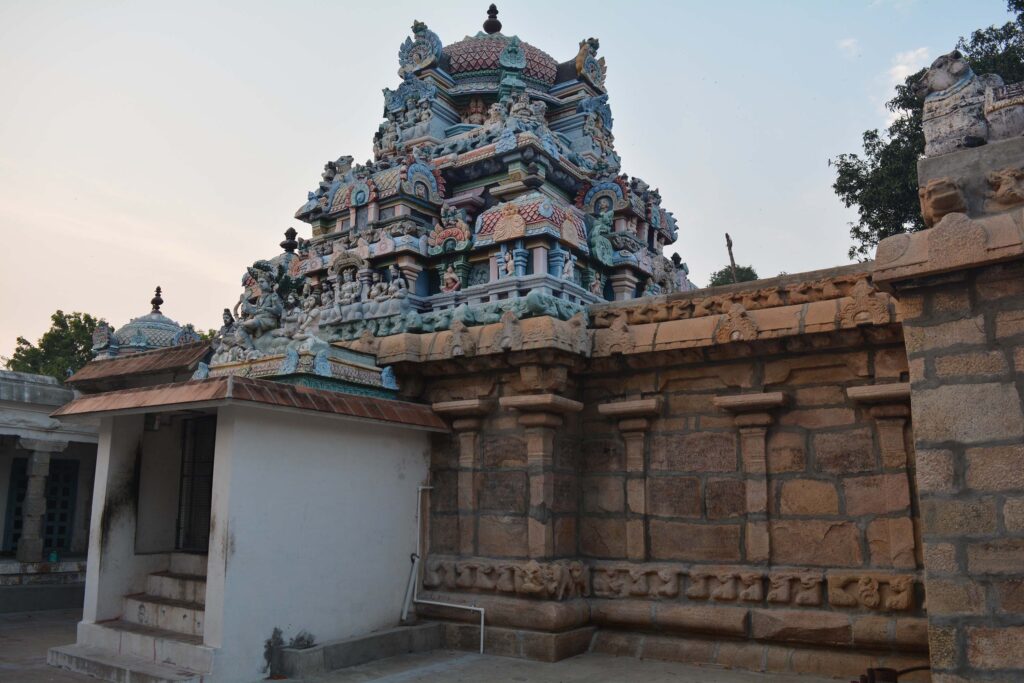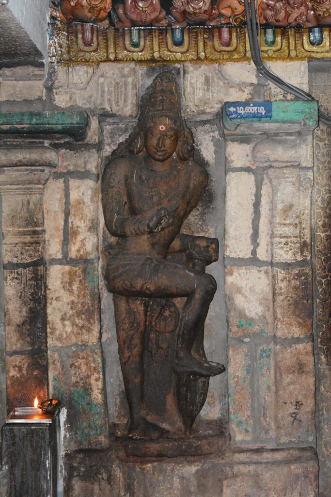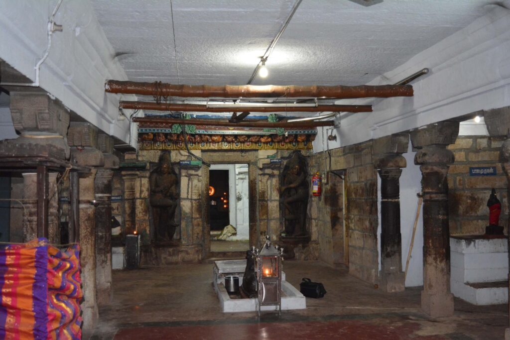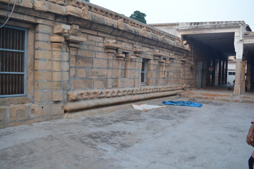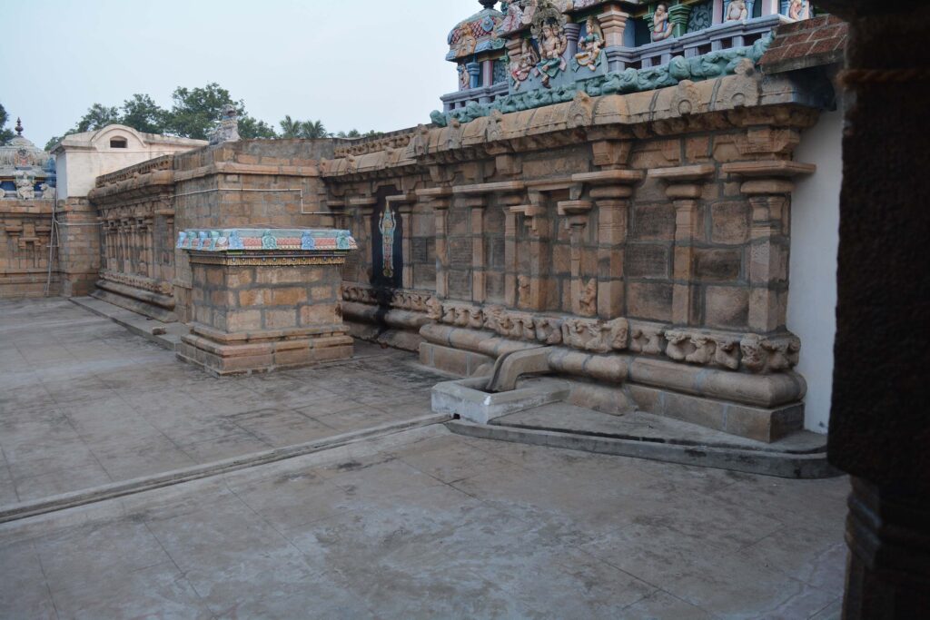 On the southern side of the maha mandapa, a window is seen in between the middle two pilasters whereas on either side between the pilasters niches are seen, Lord Siva in standing posture is housed in the eastern niche, the western niche is empty. On the northern side, the space between the middle pilasters are adorned with niches, all the three niches are empty. The niches on both sides are flanked by the brahmakantha split pilasters, the pilasters possess the same features of the pilasters of the mother wall and crowned by plain thorana. Besides, in all the niches a padma pitha is seen. In between the mukha mandapa and the maha mandapa an interconnecting construction is seen, it consists of plain wall without proper features of a tala, probably the idainazhigai might have been renovated as a closed enclosure.