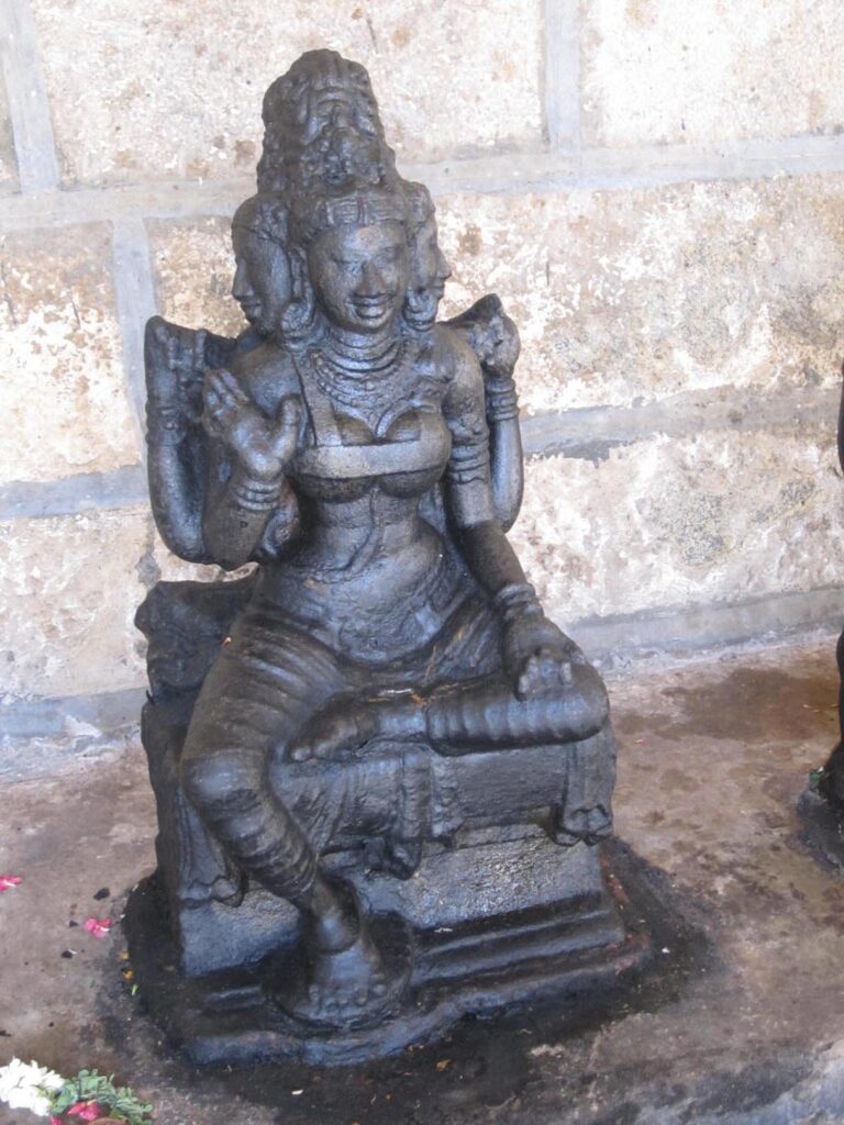 Two sets of Saptamatrika assemblages are seen in the inner prakara thiruchurru, in that, the Gods and Goddesses as individual icons is exquisite and the attributes of the sculpture place them to Chola period. The Goddesses are placed in the order of Brahmi, Maheswari, Kaumari, Vaishnavi, Varahi, Indrani and Chamundi, in addition, the goddesses are guarded by Lord Virabhadra and Lord Ganesa. All the deities are seated on a pedestal.
