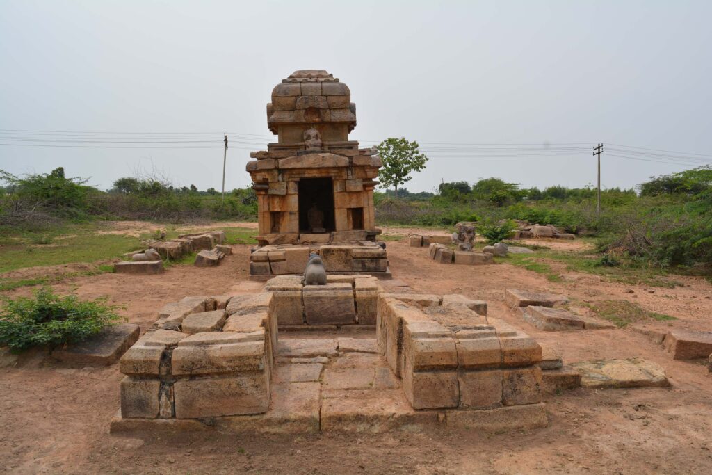 The gopura leads to the prakara of the complex, a Nandi is seen seated on a pitha. Leftover base of three shrines are seen on the northern side of the prakara and as like, leftover base of two sub-shrines are seen on the western side of the prakara and lot of debris are seen around the temple.