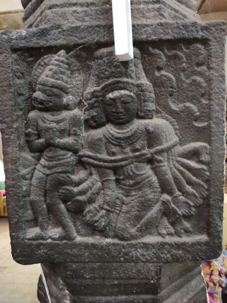 In Mahalingaswami temple, the humiliating defeat of Ravana by Vali is depicted in the middle square in one of the pillar on the left side proper of the mandapa. The panel is framed with square border, two figures are shown inside with clouds in the backdrop; a monkey faced figure and to his left is a multi-headed cum arms figure. The monkey faced figure is in Anjali hasta, while the multi-headed cum arms figure is fastened by rope and seems like kneeling in posture. The tied and kneeling posture denotes as subdued. The monkey faced figure standing in Anjali hasta is Vali in his prayers while the multi-headed cum arms figure is Ravana, shown as tied and subdued, probably the rope might be the tail of Vali.