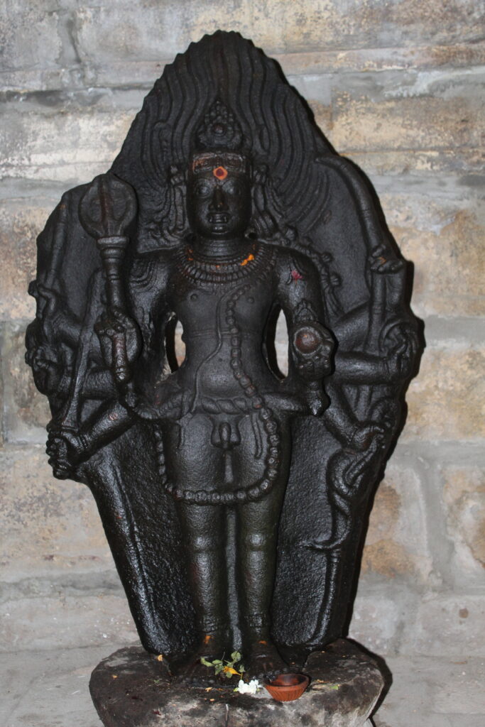 The God is formed as a bas-relief sculpture, in nude posture, is standing in sama on a padma-pitha, the locks are arranged as sudarmudi and decked with ornamental head-patta and patrapurima, crescent moon in the left, snake in the right. The ears are elongated and decked with patrakundala in the left, makarakundala in the right, kandigai, stone studded charapali and pearl mala adorns the neck, keyura and kankanas in the arms, udarabanda in the abdomen, rings in the fingers. In addition, thazhseri decks the ankle and virakkalal is worn just above the ankle. Yajnopavita is worn in upavitha fashion, along with this a long scull garland extending upto the thigh bejewel the God. A pair of snakes is seen entwining the waist with their hood raised on either side under the front pair of arms and their tail dangle in the thigh.